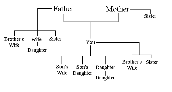 The above was drawn based on Leviticus 18:6-16. Here is the text. Leviticus 18:6-16 6 None of you shall approach to any who are near of kin to him, to uncover their nakedness. I am Yahweh. 7 You shall not uncover the nakedness of your father or the nakedness of your mother. She is your mother; you shall not uncover her nakedness. 8 You shall not uncover the nakedness of your father's wife. It is your father's nakedness. 9 You shall not uncover the nakedness of your sister, the daughter of your father or the daughter of your mother, born at home or born away. Their nakedness you shall not uncover. 10 The nakedness of your son's daughter, or of your daughter's daughter, you shall not uncover their nakedness. For theirs is your own nakedness. 11 You shall not uncover the nakedness of the daughter of your father's wife, begotten of your father. She is your sister. 12 You shall not uncover the nakedness of your father's sister. She is your father's near kinswoman. 13 You shall not uncover the nakedness of your mother's sister. For she is your mother's near kinswoman. 14 You shall not uncover the nakedness of your father's brother. You shall not approach his wife. She is your aunt. 15 You shall not uncover the nakedness of your daughter-in-law. She is your son's wife. You shall not uncover her nakedness. 16 You shall not uncover the nakedness of your brother's wife. It is your brother's nakedness. In verse 17 Yahweh adds: 17 You shall not uncover the nakedness of a woman and her daughter, neither shall you undertake to uncover her son's daughter, or her daughter's daughter. They are her near kinswomen; it is wickedness Yahweh in verse 18 also says, 18 And you shall not take a wife to her sister, to vex her, to uncover her nakedness, beside the other in her life. It is ok for a man to take a wife's sister as a wife. The verse is talking about more intimate times and is dealt with in this article. Verse 19 says that you should not have intercourse with a woman while she is having her period. 19 Also you shall not approach to a woman to uncover her nakedness in the impurity of her uncleanness. Verse 20 says that you shall not have intercourse with your neighbors wife. 20 And you shall not lie carnally with your neighbor's wife, to defile yourself with her. Verse 22 says that you should not have intercourse with a man as you would a woman, it is an abomination. Anal intercourse is the prohibition here and also includes doing so with a woman. This is the true meaning of Romans 1:26-27. 22 You shall not lie with mankind as with womankind. It is abomination to God. Verse 23 says that you should not have intercourse with an animal. This command is not repeated in the new testament. This shows a flaw in the doctrine that states that if something is not repeated in the new testament that it is not a sin for us today. 23 And you shall not lie with any animal to defile yourself with it. And a woman shall not stand before an animal to lie down to it. It is a perversion. It is assumed, from other verses including the seventh commandment, Thou shall not commit adulteration, that you also know not to marry any woman who is not your neighbor or in other words you are only to marry a Christian of the same kindred (race) as yourself. Yahweh does not consider interracial relationships as marriage. Yahweh created everything and said it was good. When one "marries" a woman of another race, each race is spoiled and becomes weaker. One of the main reasons is to prevent us from losing our faith. False gods are still with us today and other races still worship them. Sometimes this is hard to see when they say they worship our God, but under closer scrutiny one may find this to be less than true. Even if they do worship our God and I do believe there are exceptions, this does not change what Yahweh said. I suggest one read the books of Ezra (Ezra 9 and 10), Nehemiah and Hosea for some good information on this. Nehemiah 10:28-30 is helpful. Hosea has a surprising amount said about this. This is a very touchy subject for most because our leaders and the media have done a very good job of changing the hearts of Christian men and women away from what the scripture plainly teaches. I would suggest that the Bible was better known seventy years ago. Seventy years ago people knew that miscegenation was wrong. I did a small study on this a while back. Click here for a not so obvious side to this subject. This comes under the seventh commandment, Thou Shall not commit Adultery. Adultery or adulteration is confusion in the scriptures for it means a mixing of seed. This mixing of seed includes animals and plant seed as well as the seed of man. Printable Version Feel free to send your helpful comments. Thank You Christian Polygyny |